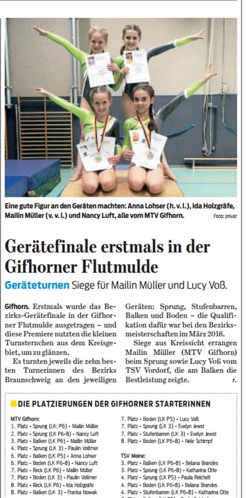 In der Pflichtstufe P6-P8 erreichte der MTV Gifhorn mit den Turnerinnen Emily Schreiber, Malou Brennecke, Ida Holzgraefe, Mailin Müller, Aenne Lenz und Lena Jarmula den 8. Platz. Die Mädchen zeigten in der Rückrunde eine stärkere Leistung mit 3 Punkten mehr, als noch in der Hinrunde.