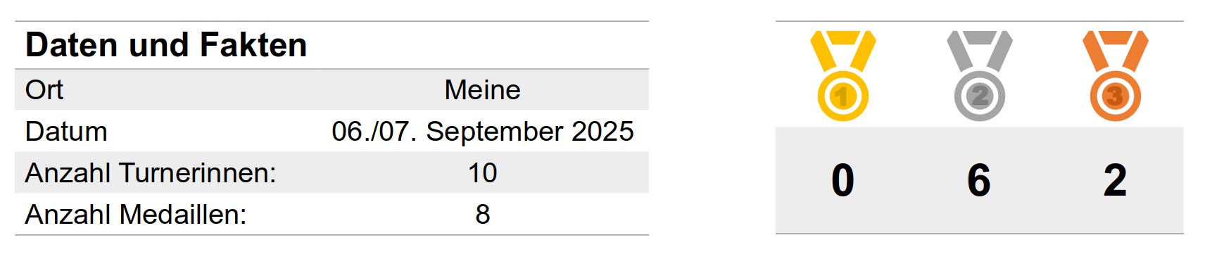 Im Mai sollte eigentlich der inzwischen traditionelle Mucki-Cup stattfinden. Bei diesem Wettbewerb werden vor allem Kraft und Beweglichkeit der Teilnehmerinnen gemessen. Aber wie viele andere geplante Wettkämpfe musste auch dieser Spaßwettkampf Corona bedingt vorerst abgesagt werden. Doch im September erarbeitete der TSV Meine ein Hygienekonzept und lud uns zu sich auf den Sportplatz ein. Mit guter Organisation und unter Berücksichtigung der Hygienevorschriften hatten wir einen spaßigen Wettbewerb bei tollem Sonnenschein. Trotz vieler - teilweise auch kurzfristigen - Ausfällen und sehr wenig Training haben wir mit 10 Medaillen bei 15 Teilnehmerinnen großartige Erfolge erzielt.