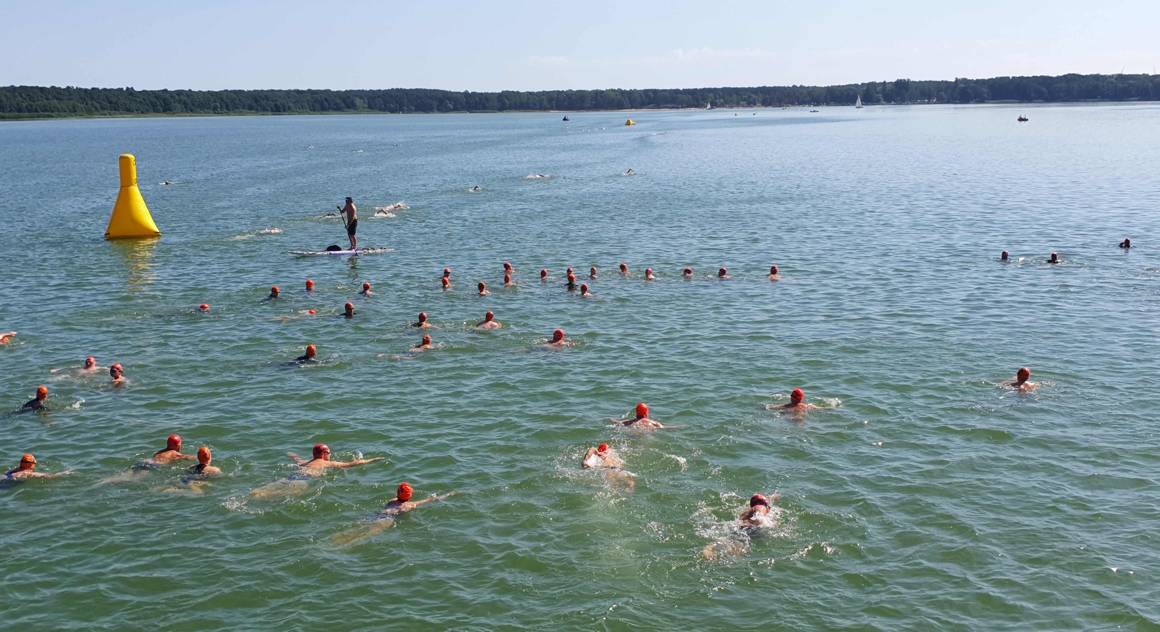 An den letzten beiden August-Wochenenden waren zwei traditionsreiche Freiwasserschwimmen erstmals meine Ziele. Zunächst wählte ich am Arendsee die mittlere Distanz von 1,9 km aus (daneben auch 0,75 und 3,8 km). Die 65 Starter auf dieser Strecke brachte das Fahrgastschiff zum Wasserstart kurz vorm gegenüberliegenden Seeufer. Bei viel Sonnenschein und ebenfalls ca. 27 °C war dies eine wunderschöne Einstimmung auf den Wettkampf. Das Wasser war mit einer Temperatur von 22 °C und wenigen Wellen von den gastgebenden Triathlon-Füchsen Osterburg bestens „vorbereitet“ worden. Nach dem alle Schwimmer im Wasser waren, gab das Signalhorn des Schiffes das Startsignal!
