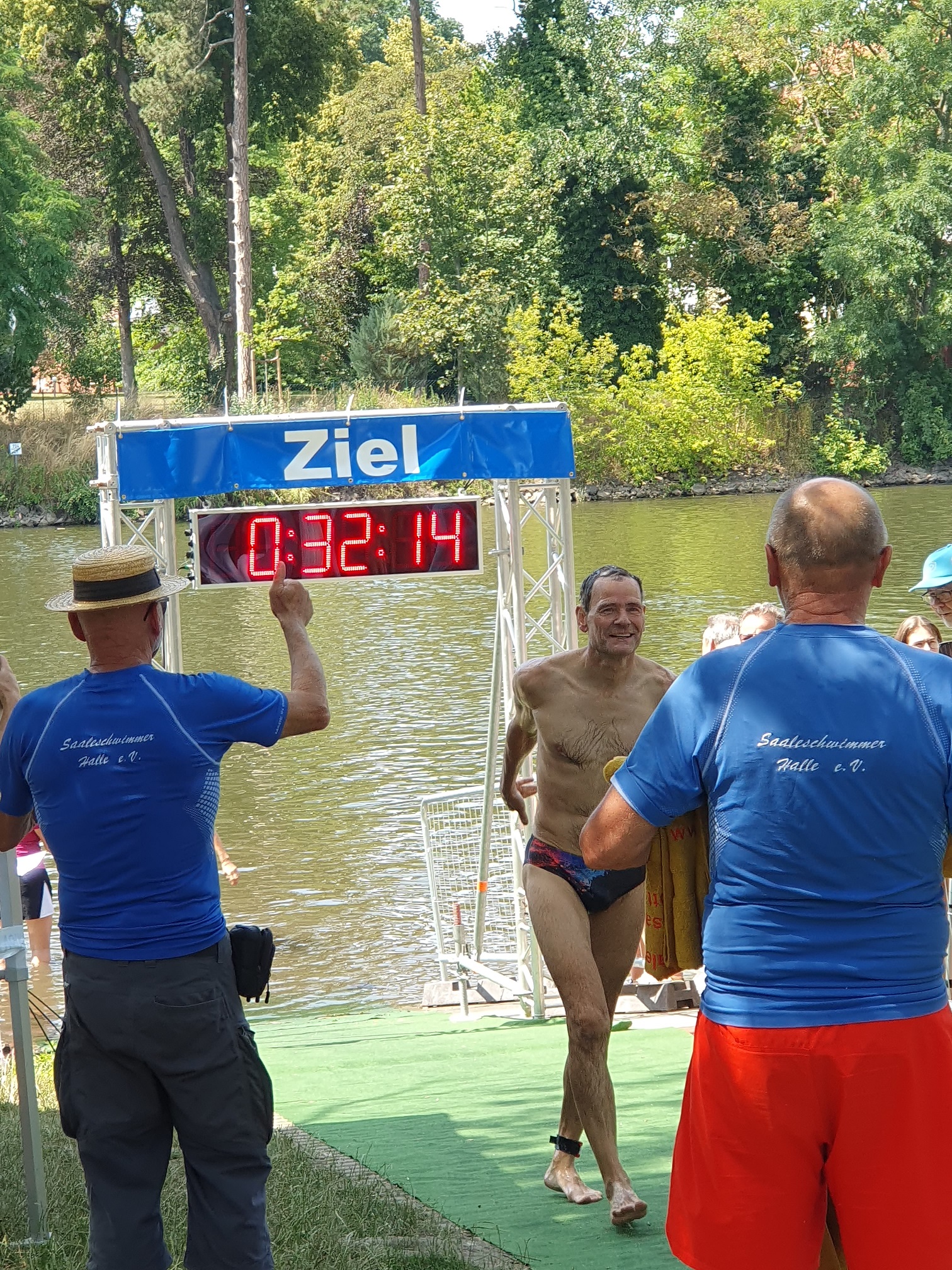 Bei 21 °C Wasser- und 27° C Lufttemperatur waren die Bedingungen exzellent. Den Start an der Einmündung des matschigen Schleusengrabens in die Saale brachten alle 145 Starter zügig hinter sich. Bald hatte jeder seinen Rhythmus gefunden und mit der Strömung der Saale ging es zügig voran. Wer wollte, konnte seine Blicke auf das schmucke Rive-Ufer mit den dahinterliegenden Felsen zur Rechten oder auf die Peißnitzinsel zur Linken schweifen lassen. Mit dem Durchschwimmen der Giebichenstein-Brücke ging es auf die letzten 500 Meter – und das Ziel war bereits in Sichtweite. Ich war gut vorangekommen und stieg auf dem 61. Platz aus dem Wasser. Die Organisatoren war sehr aufmerksam und gratulierten mir beim Überlaufen der Zeitnahme-Matte zum Geburtstag, was die Zuschauer sogleich mit einem kräftigen Beifall honorierten. Meine Familie war auch bald im Ziel und wir alle zusammen kurze Zeit später in einem nahen Café beim Genießen des Geburtstagskuchens. Einen schöneren Geburtstag kann ich mir nicht vorstellen!