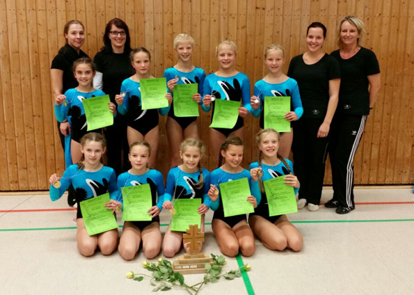 Unsere erst 4 bis 6-jährigen Minis Jette, Kimberly, Hannah und Jenny turnten fast alle ihren ersten Wettkampf und sicherten sich gleich einen super 11. Platz von 15 Mannschaften ohne Faller vom Balken. Die 2. Mannschaft mit Benita, Jule, Mailina und Sina erhielt vor allem am Boden hohe Wertungen und Benita und Sina schafften sogar die gefürchtete Rolle am Balken. Schlussendlich reichte es für einen klasse 4. Platz. Die 1. Mannschaft mit Emily, Mailin, Heleen, Ida und Henrica musste am Balken leider viele Punkte einbüßen, da nur die Rolle von Mailin klappte. Am Reck und Boden erhielten sie die höchsten Punktzahlen des Wettkampfes. Am Ende durften sie sich über einen tollen 2. Platz freuen.